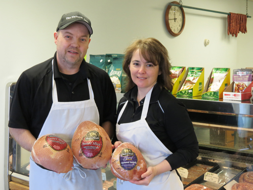 Brian and Cathy Martin, new owners of The Natural Link, pose with a selection of hams they're selling just in time for Easter. Stop in and see them at their store, located at the corner of Center Street and Portage Road, just around the corner from Hibbard's Original Frozen Custard.