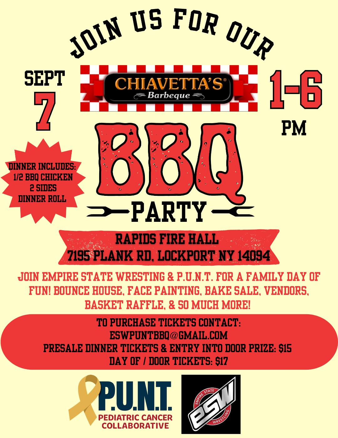 Empire State Wrestling is proud to announce a collaboration with the P.U.N.T. Foundation to host a "BBQ Party" to support local families fighting pediatric cancer. The event will occur on Saturday, Sept. 7, at Rapids Firehall in Lockport.