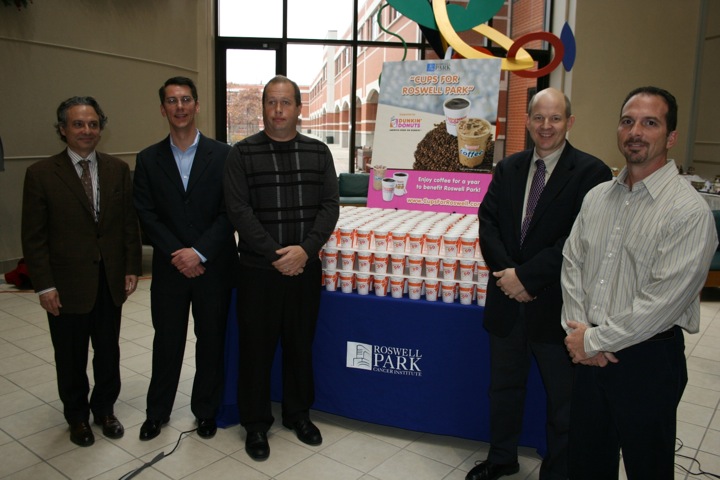 Representatives from Roswell Park Cancer Institute and Dunkin' Donuts gather to announce the "Cups for Roswell" program at Roswell Park Cancer Institute in Buffalo on Wednesday.