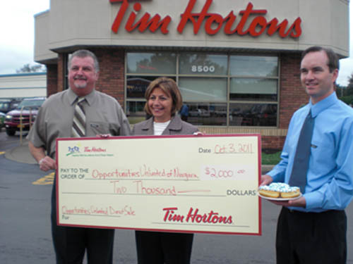 Niagara County customers purchased 2,353 "Opportunities Unlimited Donuts" in August during a special promotion created by the Niagara County-area Tim Hortons Cafe & Bake Shop restaurant owners. At the Tim Hortons Cafe & Bake Shop located at 8500 Niagara Falls Blvd., Niagara Falls, restaurant owner Bob Burns presented a check for $2,000 to Connie S. Brown, executive director of Opportunities Unlimited of Niagara.