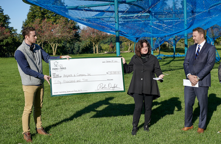 Tuesday morning, at the "Murmuration" art installation, New York nonprofit organization Parks & Trails New York presented a "big check" to Artpark & Company. This was done to acknowledge a $50,000 award to create a comprehensive wayfinding system and incorporate public Wi-Fi along Artpark's pathways. The goal is to provide data access to a diverse demographic of visitors, and to serve as a functional necessity for an interactive signage system and data collection.