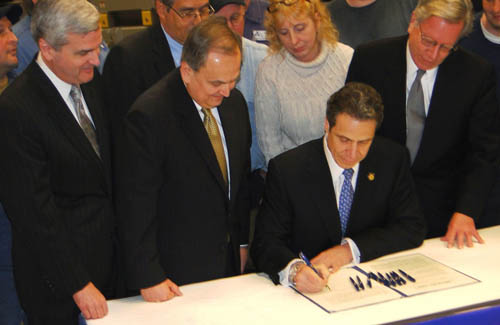 New York Gov. Andrew M. Cuomo signed a landmark power-for-jobs bill, "Recharge New York," in North Tonawanda Thursday with dozens of local leaders in attendance.