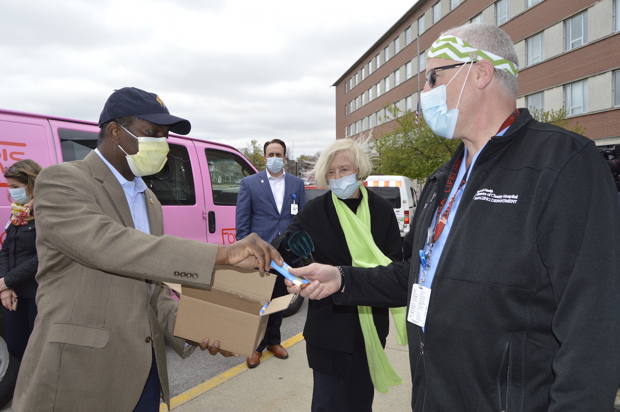 Catholic Health caregivers and leadership smiled through their surgical masks earlier this week, as they were treated to the delivery of more than 1,500 "We Applaud You" Fowler's Chocolates candy bars by City of Buffalo Mayor Byron Brown and SUNY Trustee Eunice Lewin at the Sisters of Charity Hospital Main Street Campus.