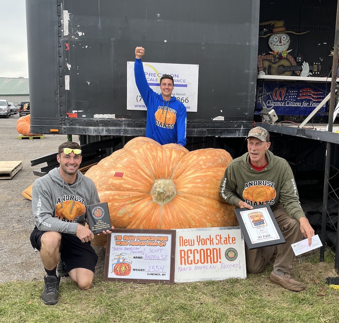 On Oct. 1, national and state records were broken for the largest pumpkin, which weighed in at 2,554 pounds. Local grower Scott Andrusz from Williamsville brought in his entry to the 27th annual World Pumpkin Weigh-off held at Great Pumpkin Farm.