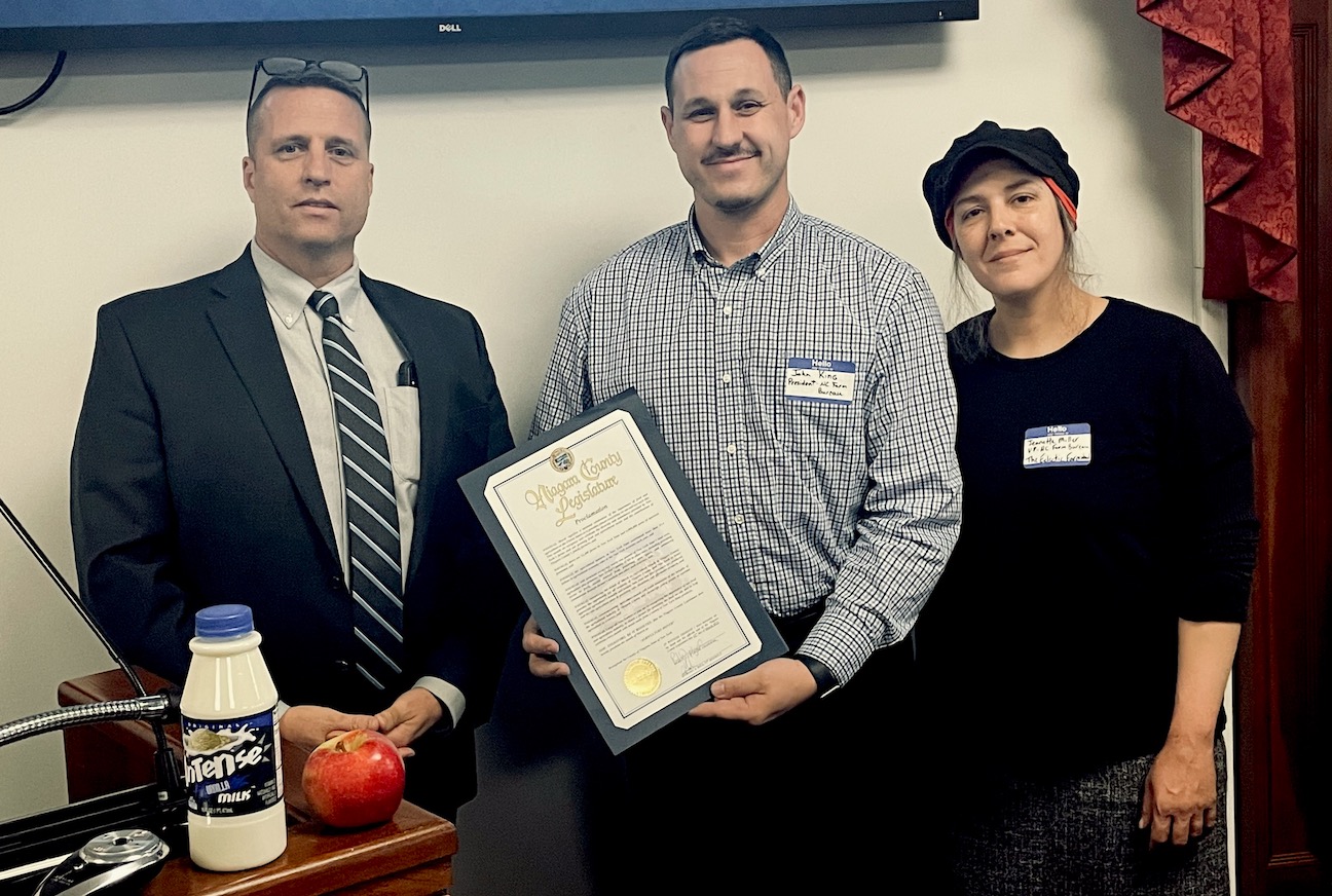 Niagara County Legislator Mike Hill presented a proclamation at Tuesday night's legislature meeting to Niagara County Farm Bureau President John King and Farm Bureau Vice President Jeannette Miller, owner of The Eclectic Farmstead in Newfane. This was done in celebration of March as National Agriculture Month.