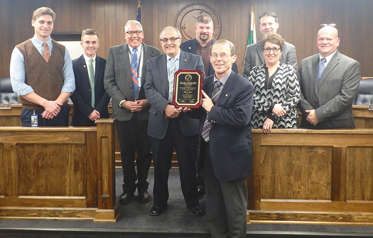 At the City of North Tonawanda reorganization meeting, board members paused to ask Mark Berube to come forward and accept a plaque for his service.