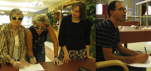 We pulled on plastic gloves with the fingertips filled with corn kernels, donned glasses that distorted our vision and tried to follow and write down a series of instructions delivered only once while the room was darkened and distracting noise was broadcast.