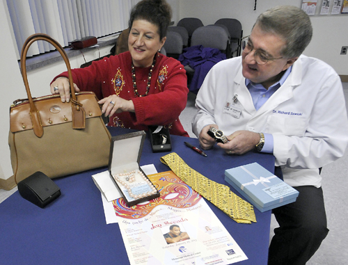 Anne and Dr. Richard Sawicki organize items for a silent auction that will be held at the 2013 Premier, Niagara Falls Memorial Medical Center's annual black tie dinner and entertainment gala.