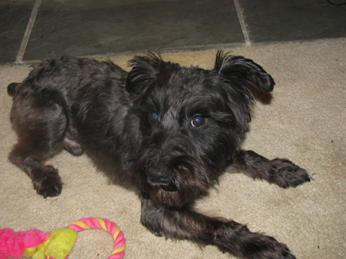 His eyes wide with panic, he darted from person to person in the room trying to find someone, anyone, who could take him away from this scary, noisy place. His raggedy, overgrown black coat was dull, and he obviously hadn't been eating - his frame was little more than skin and bone.