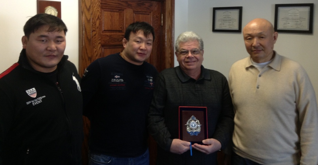 Travelers from Mongolia visited the Town of Niagara Town Hall last week. From left are Mongolian Olympic champions Naidan Tuvshinbayar (judo) and Munkhsailhan Usukhbayar (wrestling) Town of Niagara Supervisor Steve Richards; and Pagva Bira, Ph.D., chairman of the National Authority Police Force (Khuch) Bayanzurkh District, Mongolia.