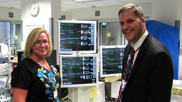 Toby White, right, of Spacelabs Healthcare Inc., demonstrates a central patient monitoring station to Yvonne DeMarco, R.N., in the Intensive Care Unit at Niagara Falls Memorial Medical Center.