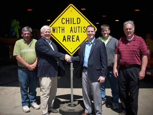 The big yellow "Child With Autism Area" sign stands at the entrance to Lakewood Drive in the Ashwood subdivision off Schultz Road.