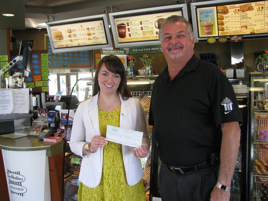 Lauren Bonilla, fundraising coordinator for the Muscular Dystrophy Association of Western New York, accepts a $1,000 check from Robert Burns at his Wheatfield Tim Hortons location on Niagara Falls Boulevard.
