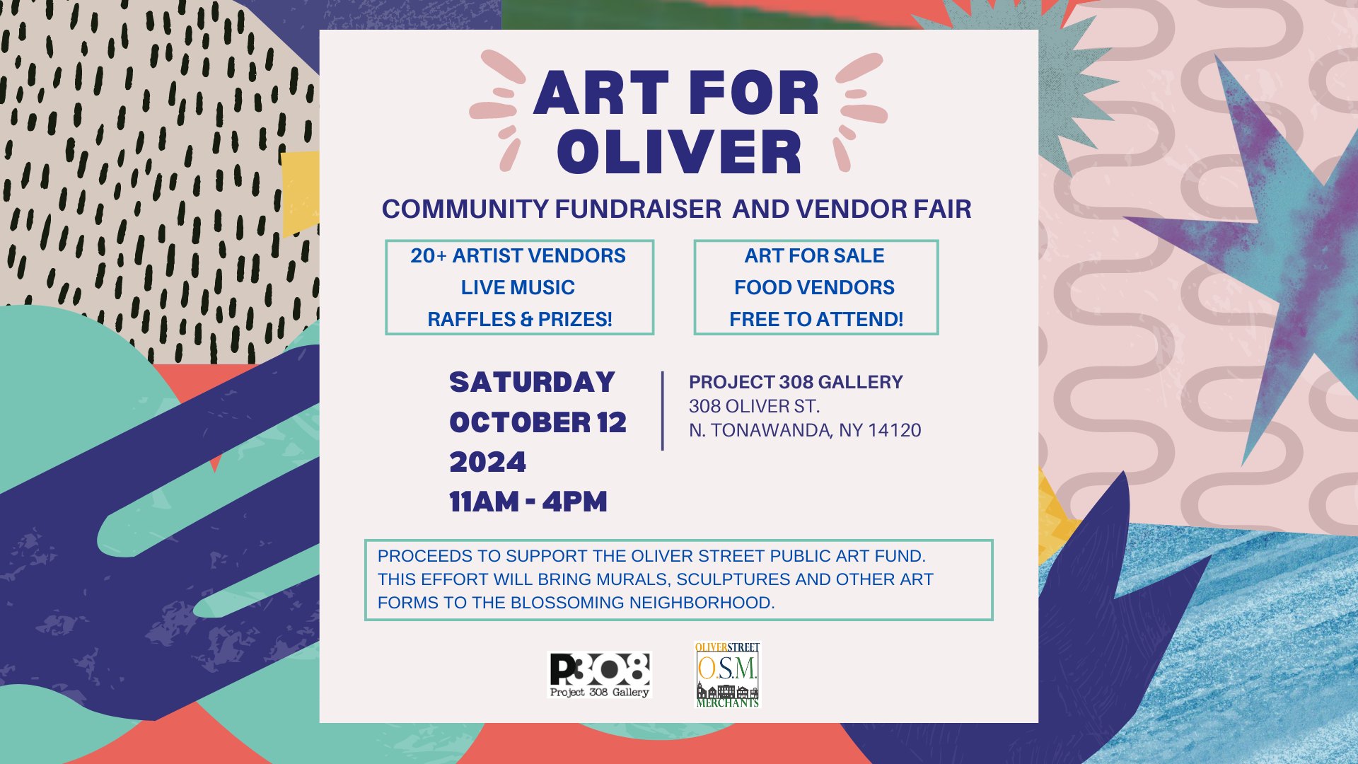 Join in for "Art for Oliver," a dynamic fundraising event supporting the Oliver Street public art initiative! This family-friendly event will bring together more than 20 artist vendors, live music, local food, a basket raffle, and more - all in celebration of art, community, and creativity.