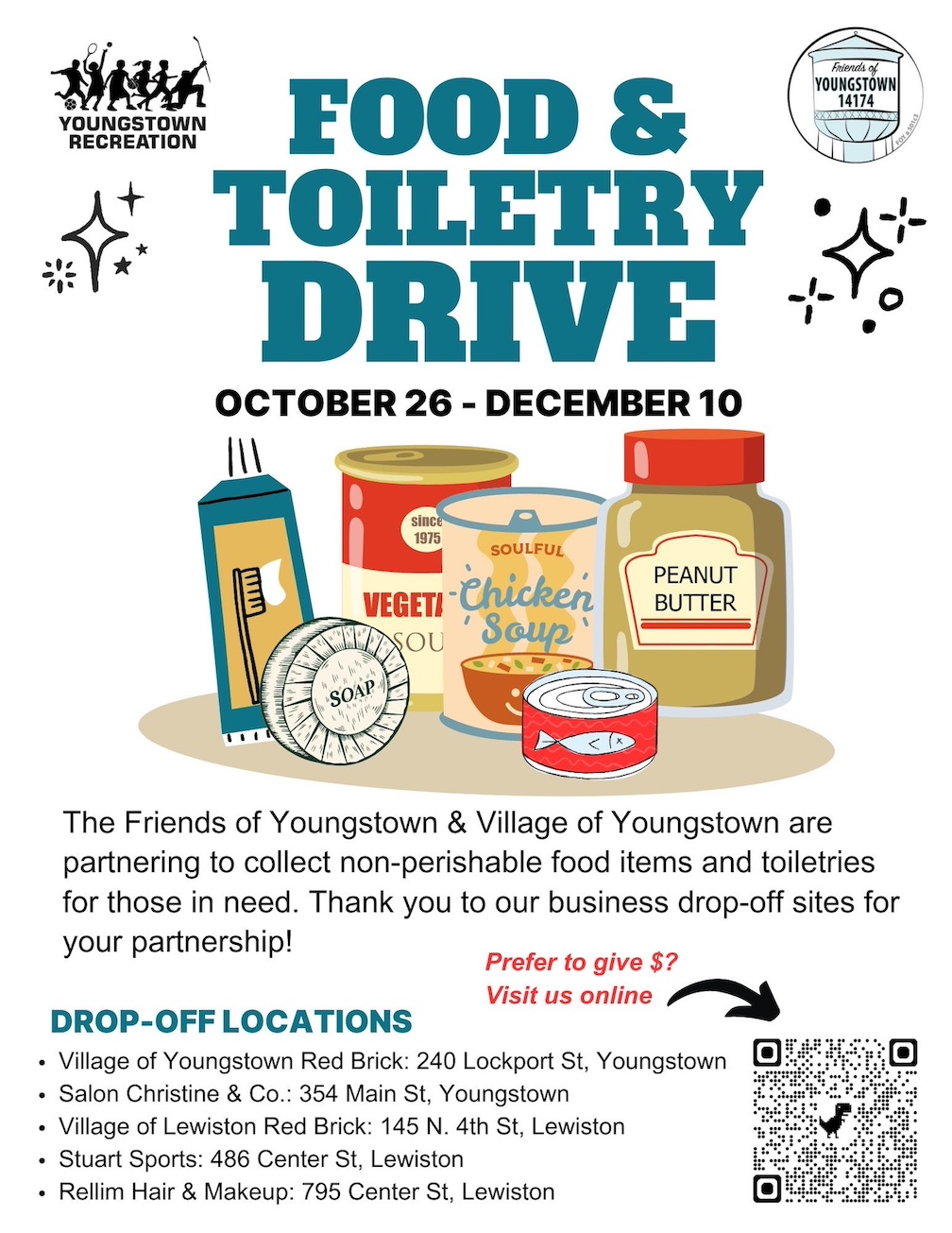 The Village of Youngstown and the Youngstown Recreation Department are partnering with Friends of Youngstown to hold a nonperishable food and toiletries drive to benefit the give and take table located at the Village of Youngstown Red Brick Building.
