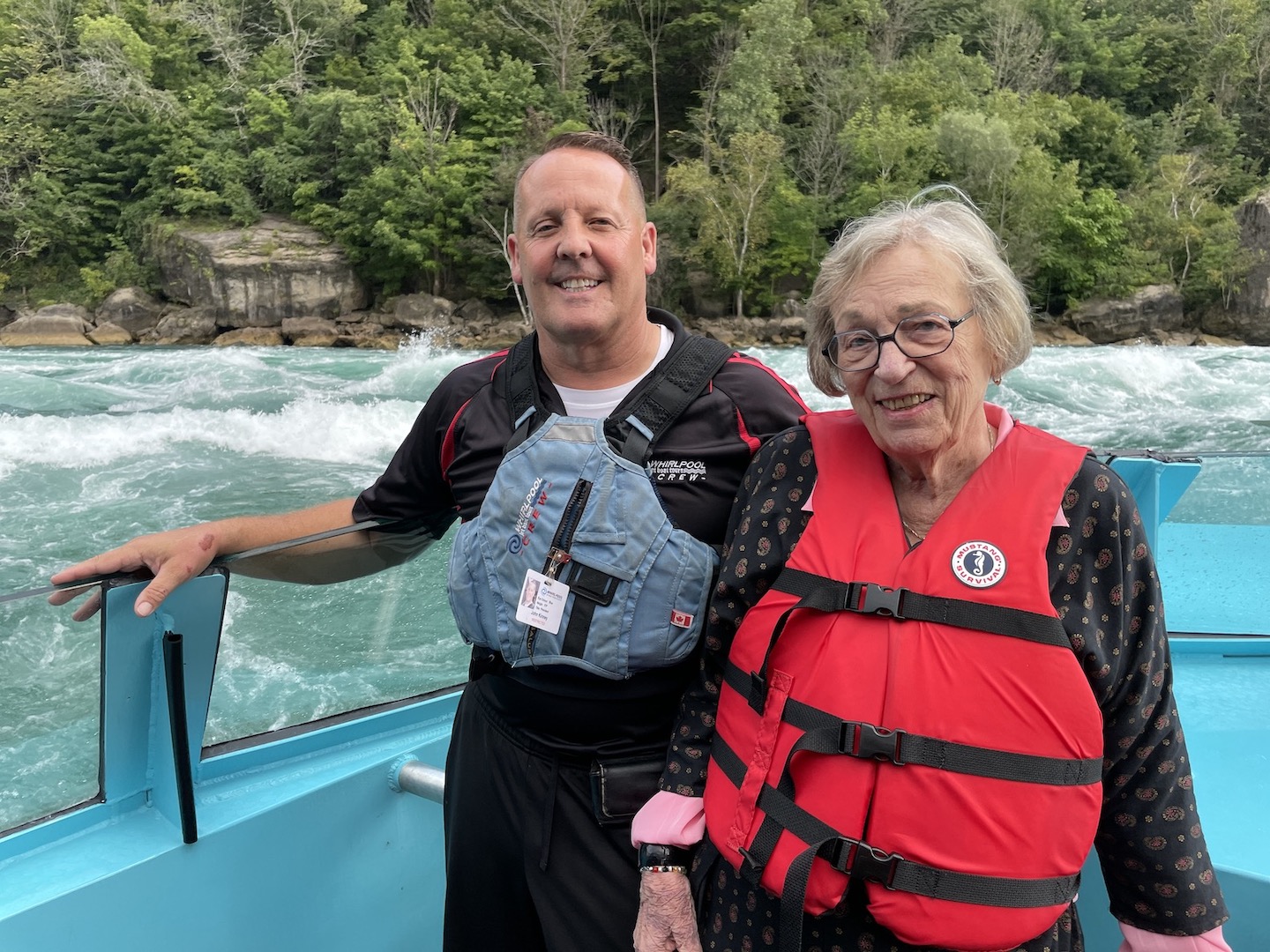 As the blueberry-colored jet boat circled around the Devil's Hole gorge class five rapids, Sandy Dugan began to cry what she called "tears of joy." Strapped in a red lifejacket, gripping the handlebar above her seat cushion, Dugan looked out on the Niagara River from this vantage point for the first time in her 84 years. Taking it all in as the vessel gently rocked up and down, she proclaimed, "This is every bit as exciting as Alaska." As the jet boat picked up steam and ascended its highest crest, Dugan exclaimed, "I'm so glad we did that. It was wonderful!"