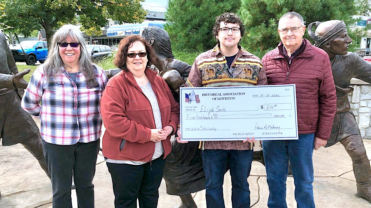 Ken Slaugenhoupt, right, president of the Historical Association of Lewiston, presents Elijah Smith, a member of the Deer Clan of the Tuscarora Nation, the annual HAL scholarship commemorating Indigenous Peoples Day, on Monday, Oct. 10.