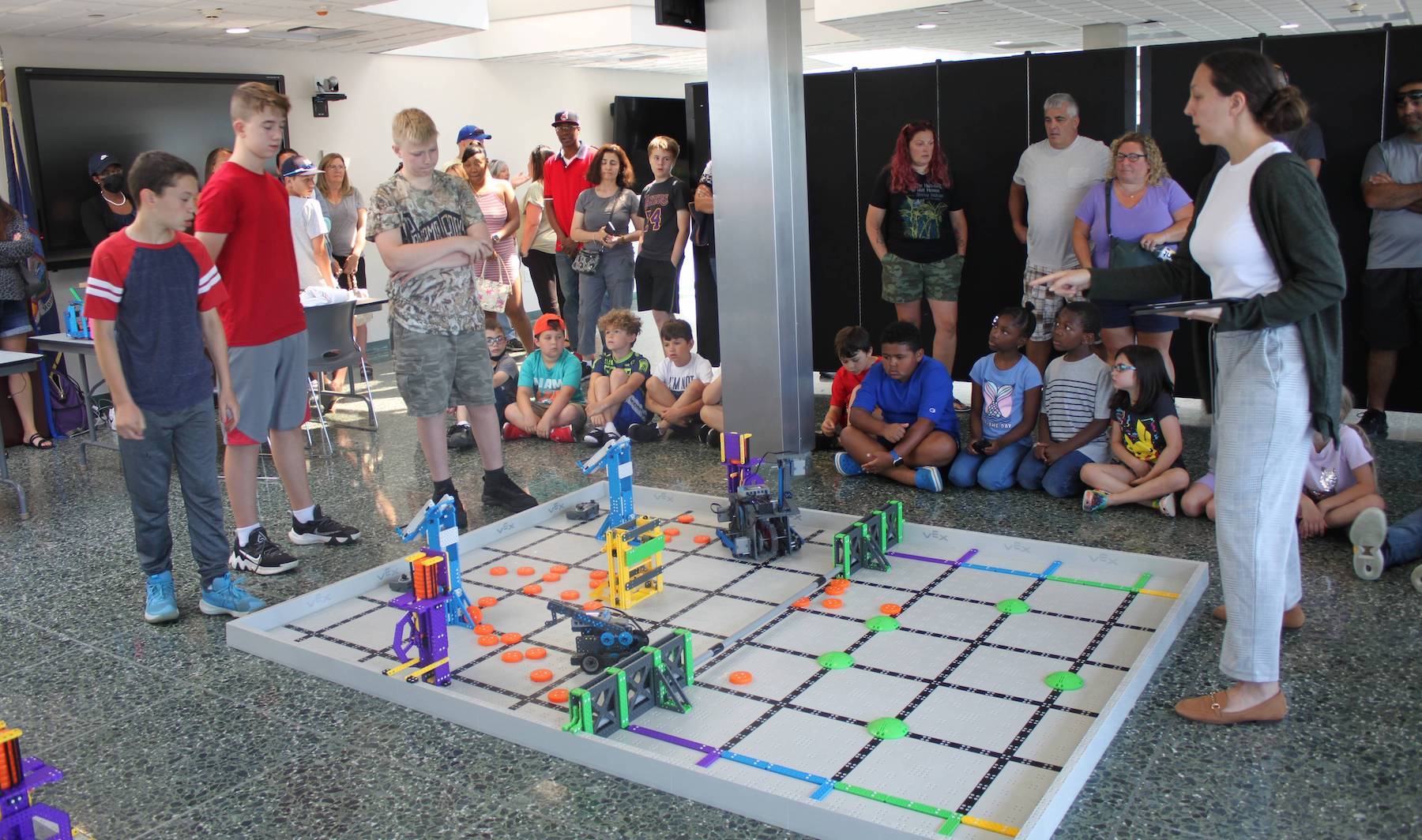 In the Niagara Falls Power Vista Visitors Center, robots maneuvered around obstacles, moved up and down ramps, threw balls through miniature basketball hoops, and scooped up orange disks that they then pushed across a grid. The demonstrations were part of the culminating event at Niagara University's Robotics Camp, which took place June 27-30.