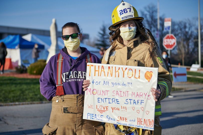 Personnel from Upper Mountain Fire Co., Lewiston Fire Co. No. 1, Youngstown Fire Co., Tri Community Ambulance, Ransomville Fire Co., Cambria Fire Co., Lewiston Police Department and the Niagara County Sheriff's Department held an "Appreciation Parade" Saturday evening for Mount St. Mary's health care workers. Lights were flashing with cheers and sirens sounding for hospital staff as the procession moved through the main parking lot as a sign of gratitude for those keeping the community safe and healthy.