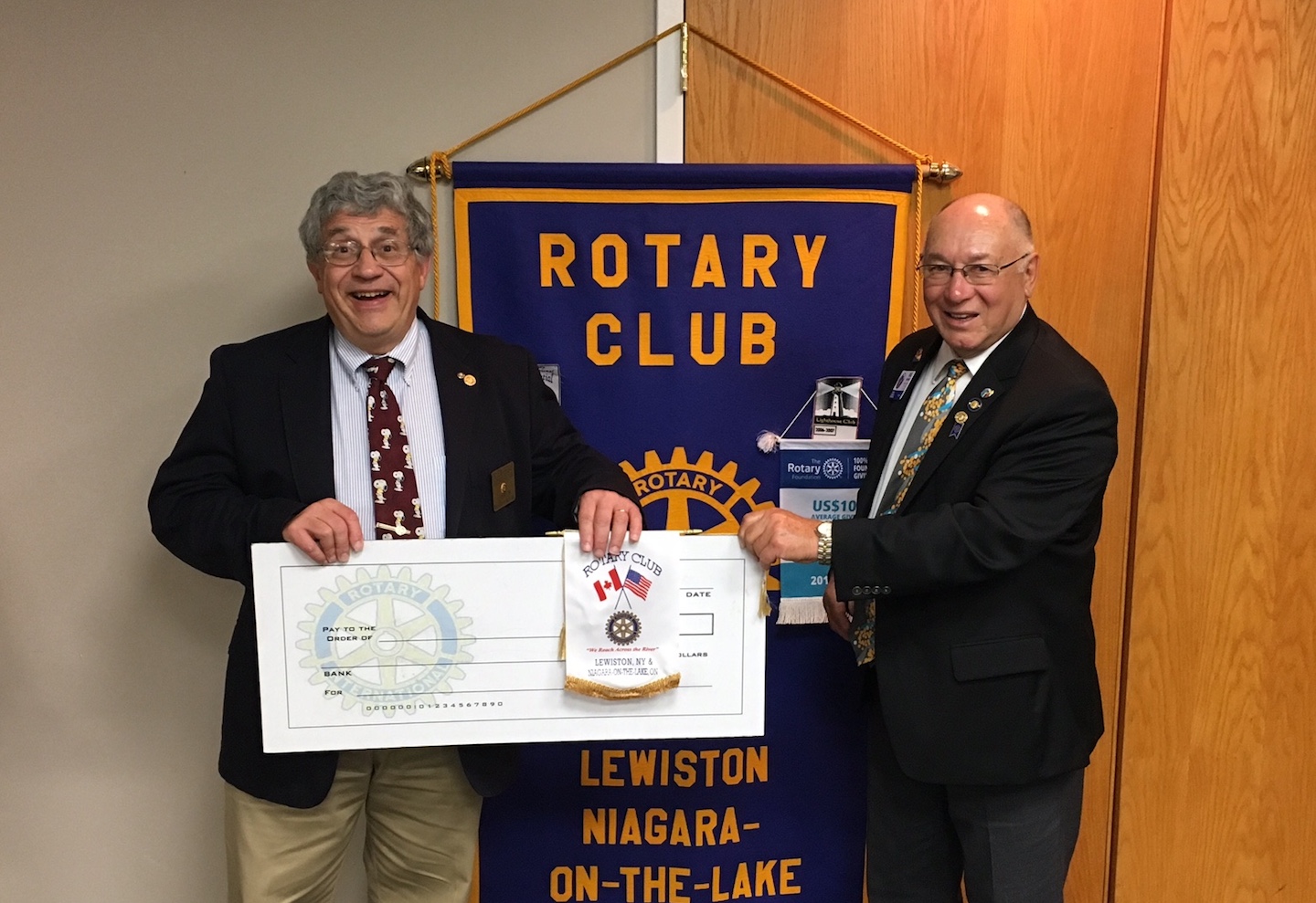 Starting the celebration of World Polio Day (Oct. 24) a little early, Rotary Club of Lewiston/Niagara-on-the-Lake Secretary Tom Gerbasi, left, presented the club's annual contribution to District 7090 Gov. Reg Madison. Funds will be used in Polio Plus-Rotary's efforts to eradicate polio.