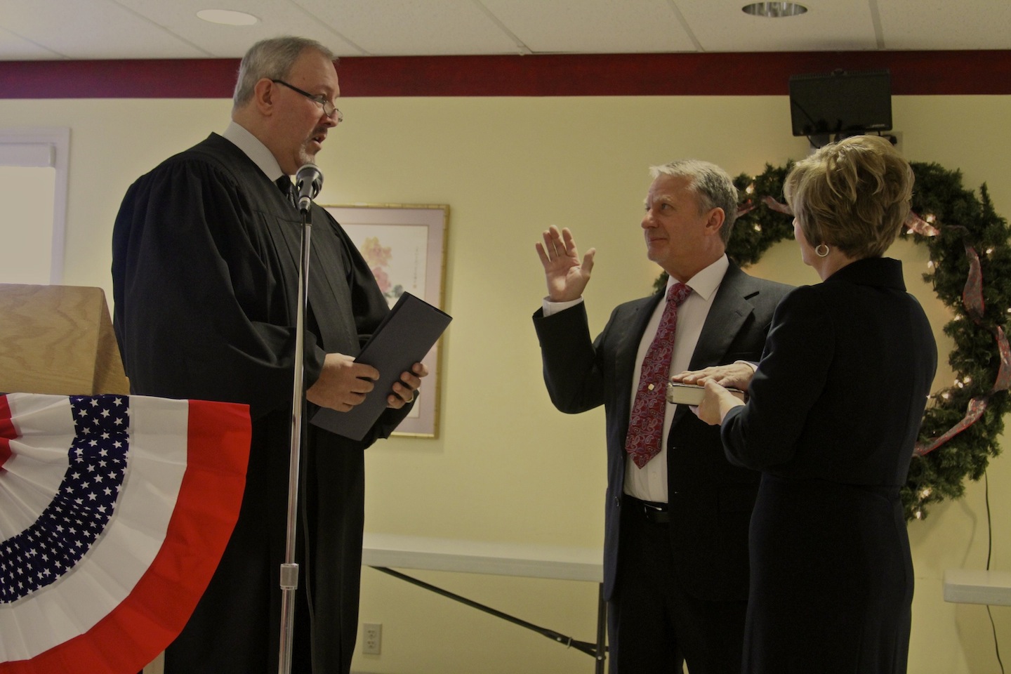 Town of Lewiston Justice Hugh Gee administers the oath to Dennis Brochey as the new supervisor's wife, Cathy, holds the Bible. The ceremony was held New Year's Day at the Lewiston Senior Center.