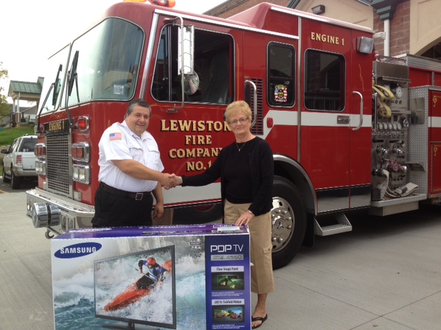 Lewiston Volunteer Fire Co. No. 1 is wrapping up its annual fund drive. This year, the company awarded a large-screen TV in a random drawing of all entries. Patricia Rose of Lewiston was the winner and is shown as Chief John Penzotti presents her with the TV.