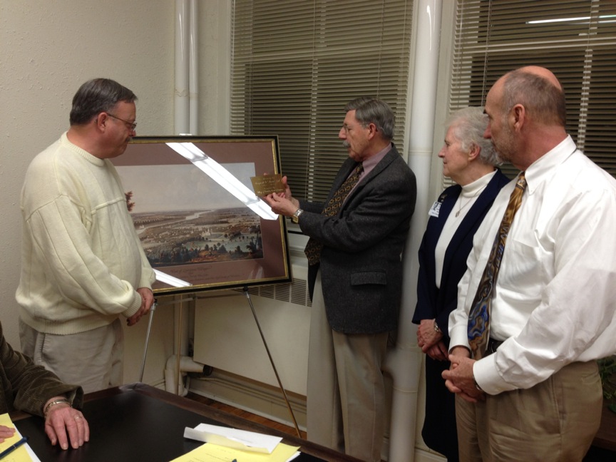 The Village of Lewiston Board of Trustees presented a framed copy of Capt. James Van Cleve's portrait of Lewiston to Mount St. Mary's Hospital.