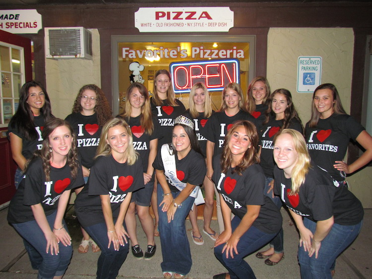 After their interviews with judges on Wednesday night at The Brickyard Pub and B.B.Q., the Peach Queen contestants ventured over to Favorite's Pizza, which donated a tray of pizza to each of them, as well as these awesome "I Love Pizza" shirts, and a slice.