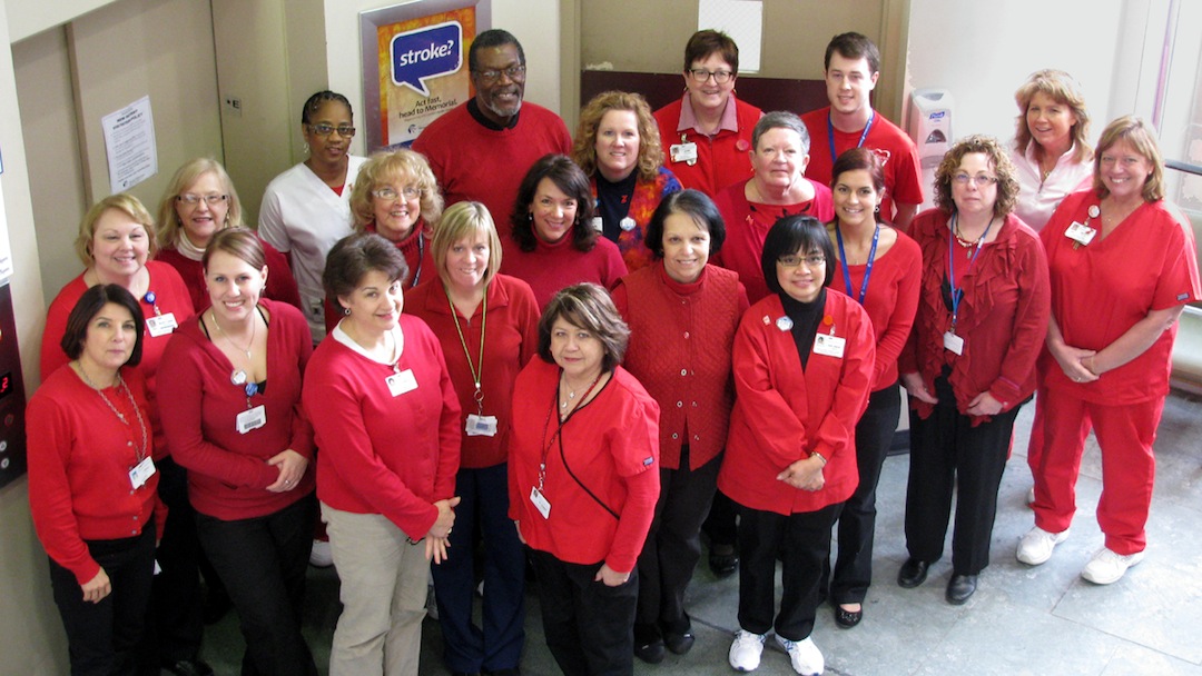 Members of the Niagara Falls Memorial Medical Center team gathered at the hospital's main entrance Friday to show their support for the 10th annual National Wear Red/Go Red for Women Day, an event dedicated to raising awareness and funds to battle heart disease in women.