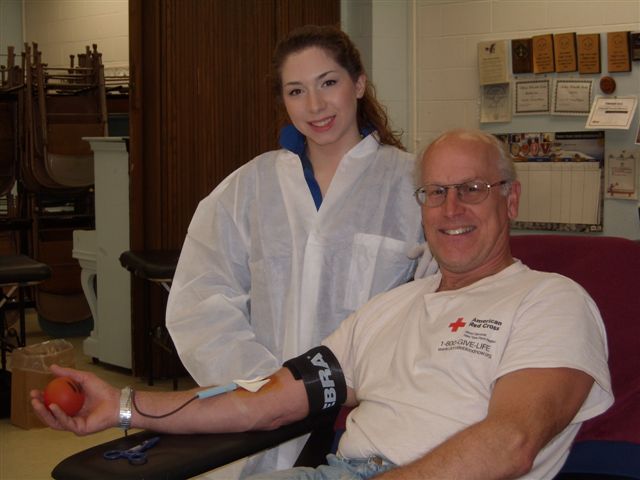 David Woodley Sr., a longtime Lewiston resident, is shown with nurse Brittany Harris donating blood this week at a Red Cross blood drive at First Presbyterian Church in the village. On Wednesday, Woodley started his 21st gallon.