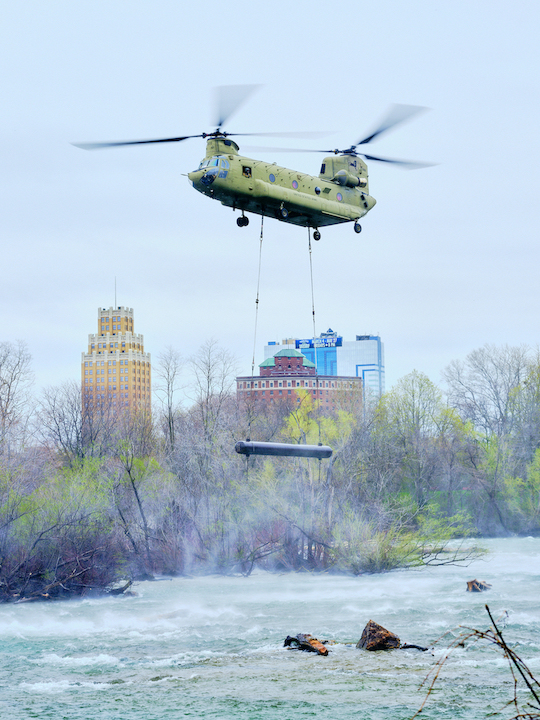 On Wednesday, New York's Army National Guard used a CH-47F Chinook heavy lift helicopter to remove a pontoon from a portion of the New York Power Authority's "ice boom" at Niagara Falls. The New York State Park Police teamed with U.S. Army aviators from the New York Army National Guard's Detachment 1, Company "B" 3rd Battalion on the operation, which began Tuesday morning with scoping.