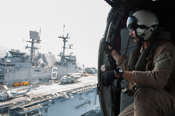 Naval Air Crewman (Helicopter) 2nd Class Robert Whelan, a native of Buffalo assigned to the "Wildcards" of Helicopter Sea Combat Squadron (HSC) 23, embarked aboard the amphibious assault ship USS America (LHA 6), looks out from the inside of an MH-60S Sea Hawk helicopter during a photo exercise in the Arabian Gulf.