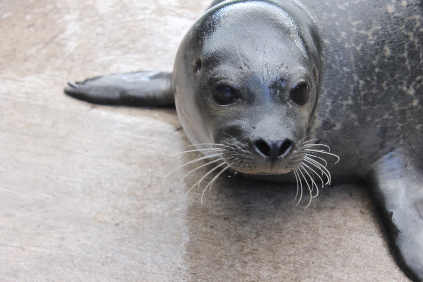A harbor seal whose rear flipper had to be amputated has made his first public appearance, and joined other rescued seals at the Aquarium of Niagara.