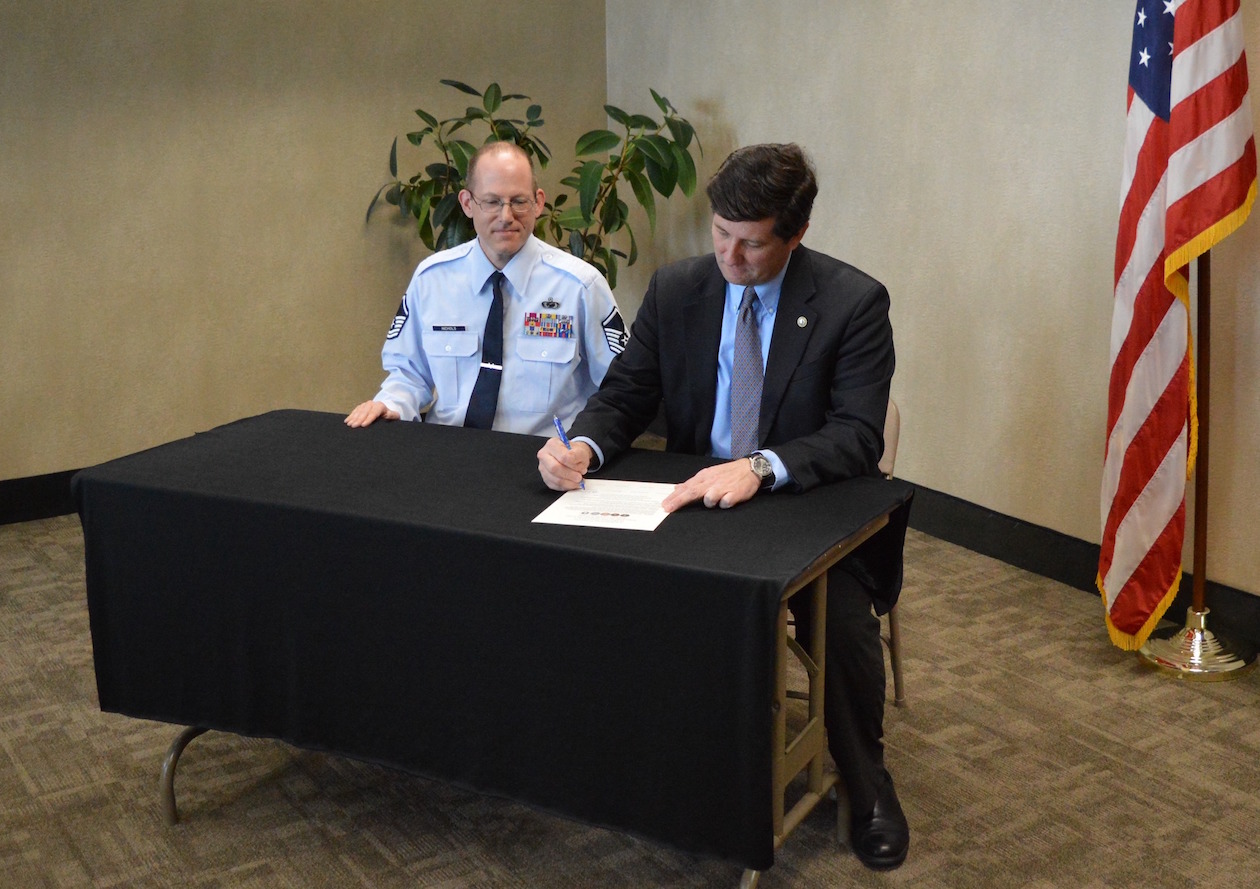 Erie County Executive Mark C. Poloncarz was joined by Kevin Nichols, public information officer for the 914th Airlift Wing (U.S. Air Force Reserve), in order to affix his signature to a proclamation being prepared in advance of Armed Forces Week and honoring all U.S. veterans.