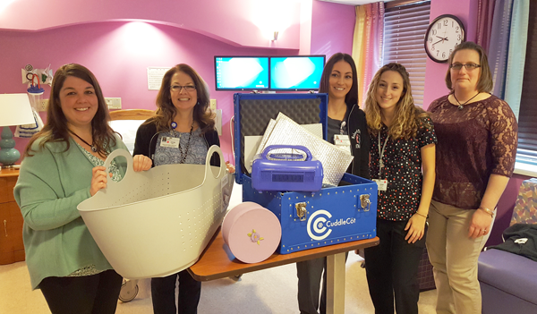 Amy DeSantis, left, and Angela Stutzman, right, of Butterfly Moon, recently presented a Cuddle Cot to the Labor & Delivery staff at Niagara Falls Memorial Medical Center.