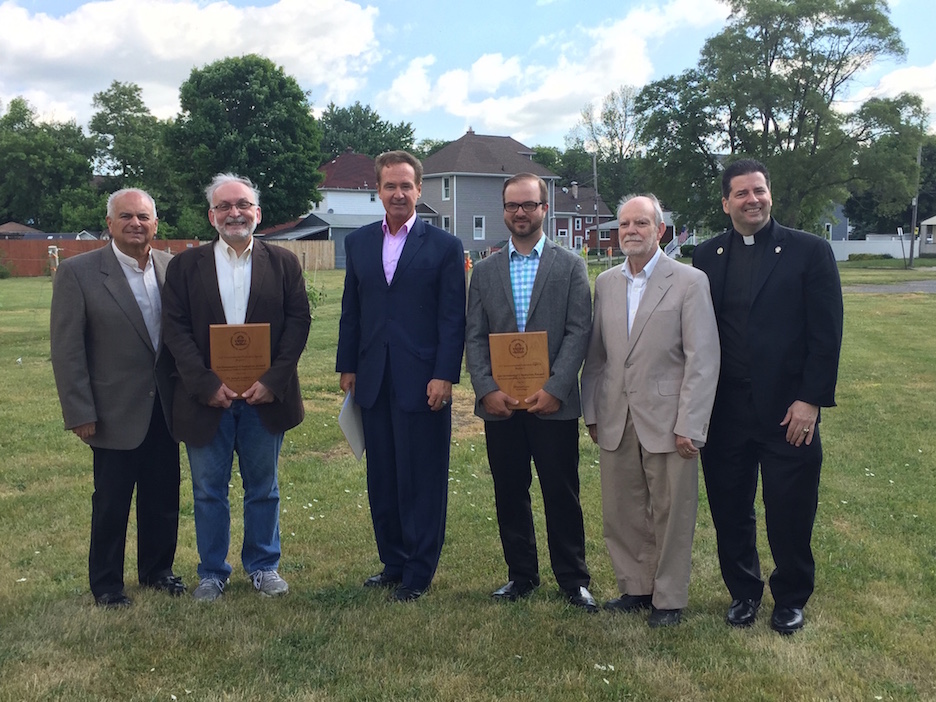 Lewiston resident Angelo Sarkees (left) presents a check to Community Missions Associate Director Joe Sbarbati, while Heart, Love and Soul Food Pantry Executive Director Sister Beth Brosmer receives a check from Modern Corporation Vice President of Community Relations Fran Giles.