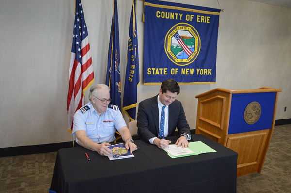 Erie County Executive Mark C. Poloncarz was joined by U.S. Coast Guard Auxiliary (Ret.) Bill Callahan, public affairs officer for the Western New York Armed Forces Committee, in order to affix his signature to a proclamation prepared in advance of Armed Forces Week. The proclamation honors all U.S. veterans.