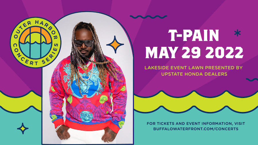The Rich Entertainment Group and Buffalo Waterfront Management Group announce Grammy Award-winning music superstar T-Pain will kick off the inaugural season of the "Outer Harbor Concert Series" at the Lakeside Event Lawn presented by the Upstate Honda Dealers. T-Pain will take the stage Sunday, May 29, with gates opening at 5 p.m.