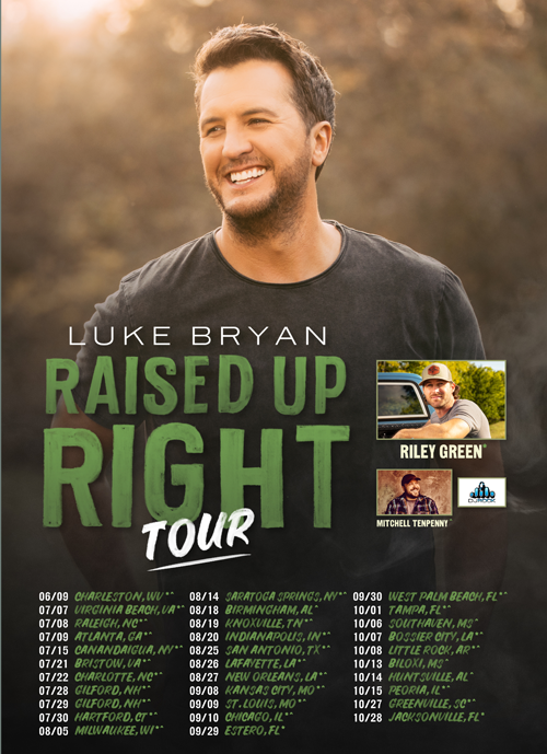 Five-time Entertainer of the Year Luke Bryan, who in his career has played sold-out shows for 12 million-plus fans inclusive of nearly 40 stadium concerts, "Spring Break" shows, "Farm Tours" and seven sold-out "Crash My Playa" destination concerts, is revealing details of his "Raised Up Right" Tour. The show will launch June 9 in Charleston, West Virginia, featuring Riley Green, Mitchell Tenpenny and DJ Rock.