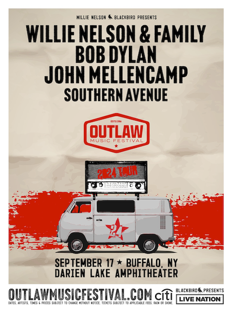 Willie Nelson, Mark Rothbaum, Keith Wortman, Blackbird Presents, and Live Nation are thrilled to announce the 2024 Outlaw Music Festival Tour featuring an unprecedented lineup - including headliners Willie Nelson & Family, Bob Dylan, John Mellencamp, and Southern Avenue - will make a stop at Darien Lake Amphitheater on Tuesday, Sept. 17.