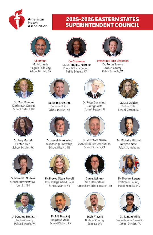 Superintendents across the northeast region are working with the American Heart Association to improve the health and well-being of students, families and educators. Nineteen superintendents were selected to serve as volunteer leaders for the second year of the AHA's Eastern States Superintendent Council.