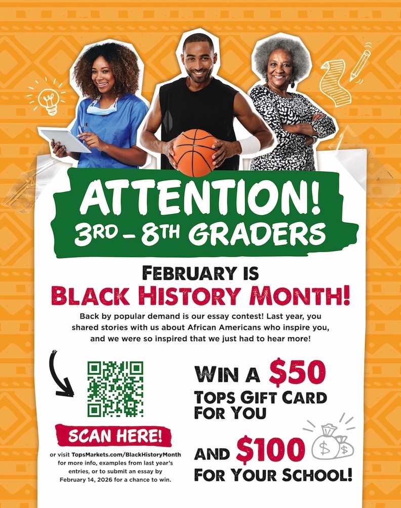 Tops Friendly Markets is excited to announce its sixth annual contest celebrating Black History Month. This initiative offers students in grades 3-8 an opportunity to honor and celebrate African American individuals who inspire them.