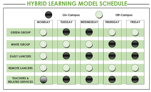 Mondays are normally a day of virtual learning for all students in the hybrid model. With the Veterans Day holiday on Wednesday, there will be no virtual day this week. Hybrid students in the green group will be on campus on Monday and Tuesday, while students in the white group will be on campus Thursday and Friday. The district will be closed Wednesday, Nov. 11, in observance of Veterans Day.