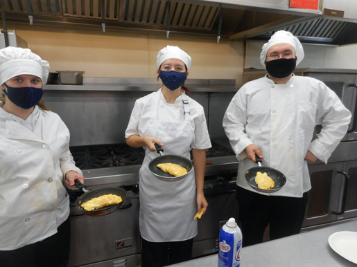 Students in Robert Ihle's Culinary Arts class at the Niagara Career and Technical Education Center spent some time perfecting their omelet making skills. Pictured are Samantha Calato (Niagara Falls), Emily Allan (North Tonawanda) and Austin Gibbs (Lewiston-Porter) with their creations.