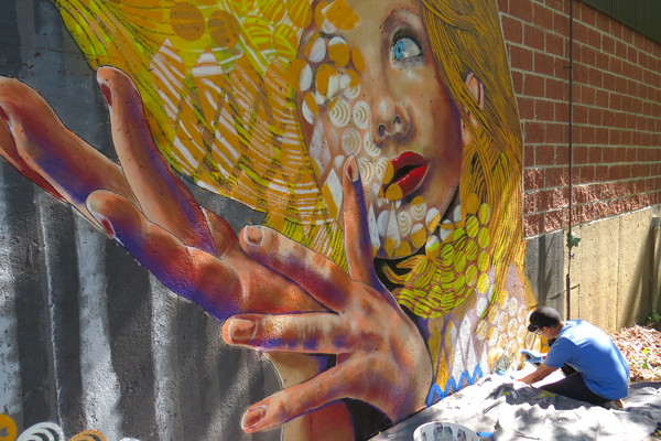 Western New York artist Chuck Tingley is creating a permanent mural at Artpark on the art gallery's north exterior wall. He is using spray paint, acrylic, markers and stencils to create the images pictured.