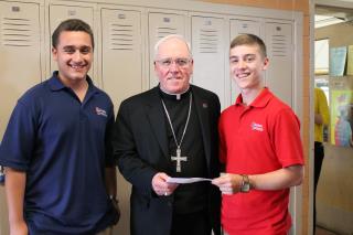 During a recent visit to Niagara Catholic Jr./Sr. High School, the Most Rev. Richard J. Malone, bishop of the Buffalo Diocese, was presented with a sizable donation to benefit Catholic Charities.
