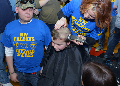 Students and staff lined up to be sheared at the "Bald For Buck$" portion of the Buffalo Sabres Alumni vs. Faculty basketball game fundraiser at Niagara-Wheatfield High School. The event raised $8,156.76.