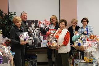 Sean and Doreen O'Connor, chair couple for the 2014 Niagara Catholic Jr./Sr. High School Mardi Gras Dinner and Auction, stop by to admire baskets and donations put together by Cindy Williams, Patti Rougeux, Jane Macri and Maureen Olson.