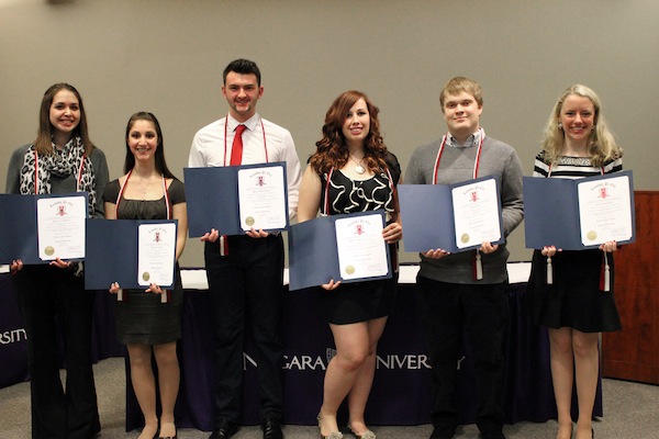 Six Niagara University students became lifetime members of Lambda Pi Eta, the honor society for undergraduate communication students, during an induction ceremony held Wednesday in Dunleavy Hall.