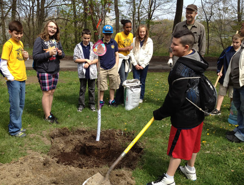 PHOTO GALLERY: Henry J. Kalfas Elementary School teachers Randy Broeker and Chris Kusk brought three-dozen sixth-grade students to Niagara Falls State Park Wednesday to plant new trees.